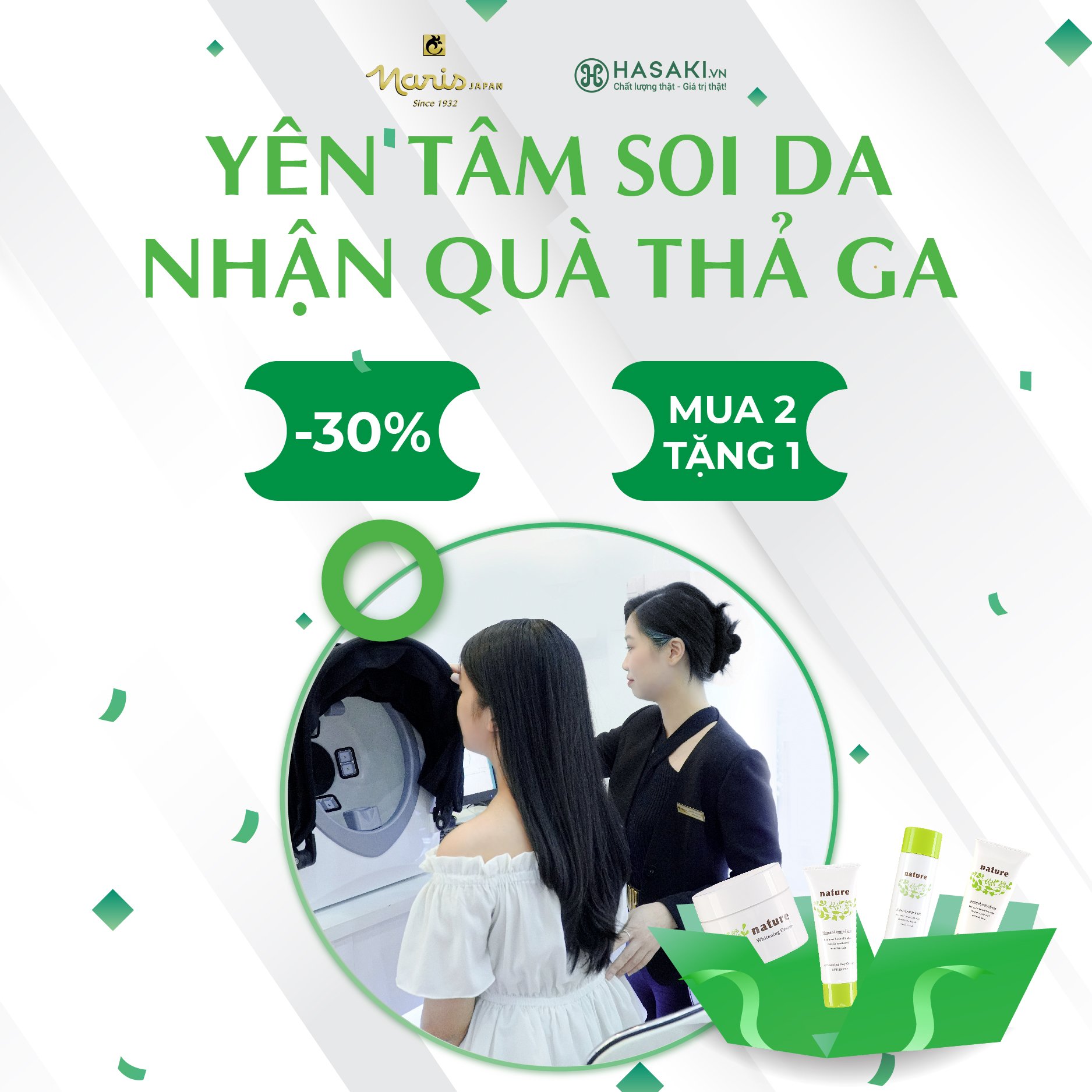 Chính vì vậy, Naris quyết định mang đến công nghệ soi da để giúp quý khách hàng có được những phân tích chi tiết và hiểu thêm về tình trạng da. Không chỉ vậy, trải nghiệm giải pháp dưỡng trắng sinh học tiêu chuẩn kép với bộ sản phẩm Nature Whitening cũng được gửi đến quý khách hàng.